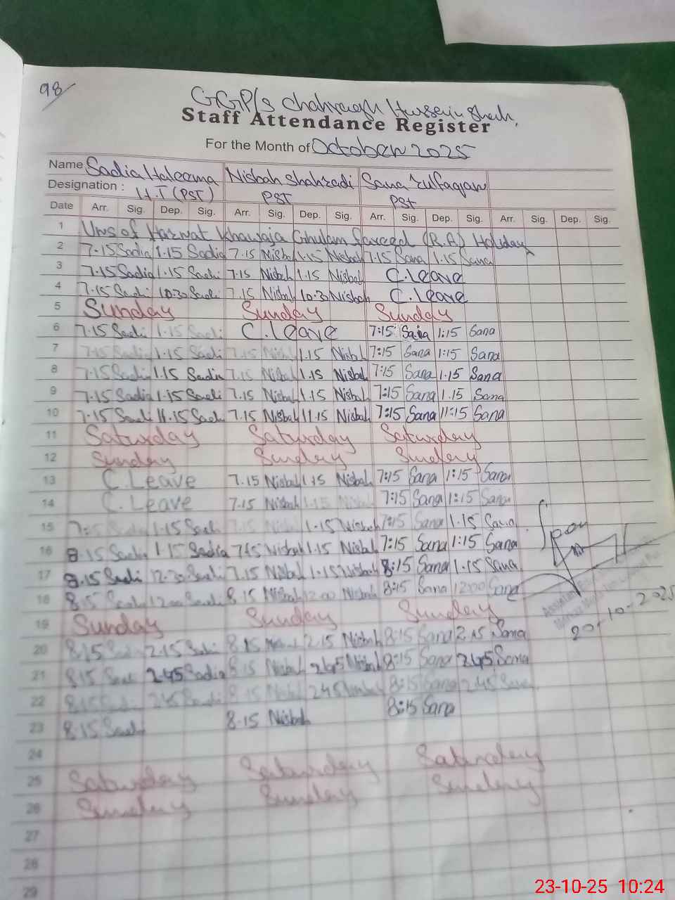 | CNIC | Full Name | Designation | R/C | Absence During Last Calender Month |