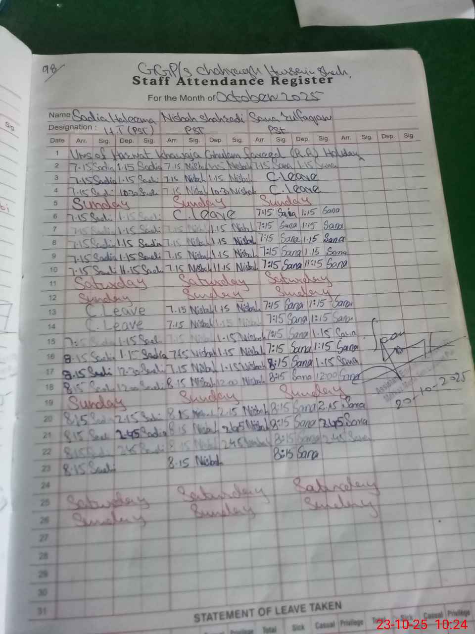 | Leave | Duty | Absent | Maternity | Medical | Ex- Pak |