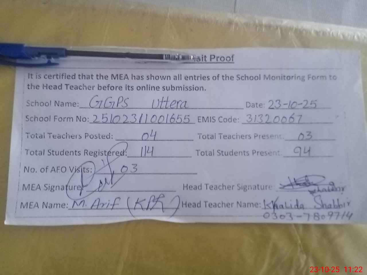 | Attendance Register | Head Teacher | MEA with School | Visit Proof |