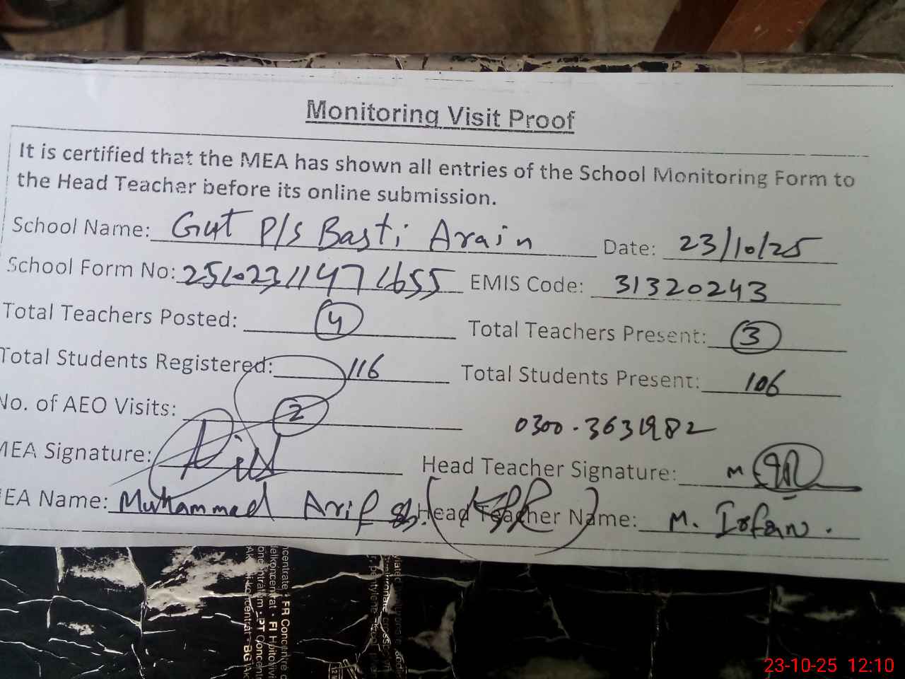 | Attendance Register | Head Teacher | MEA with School | Visit Proof |