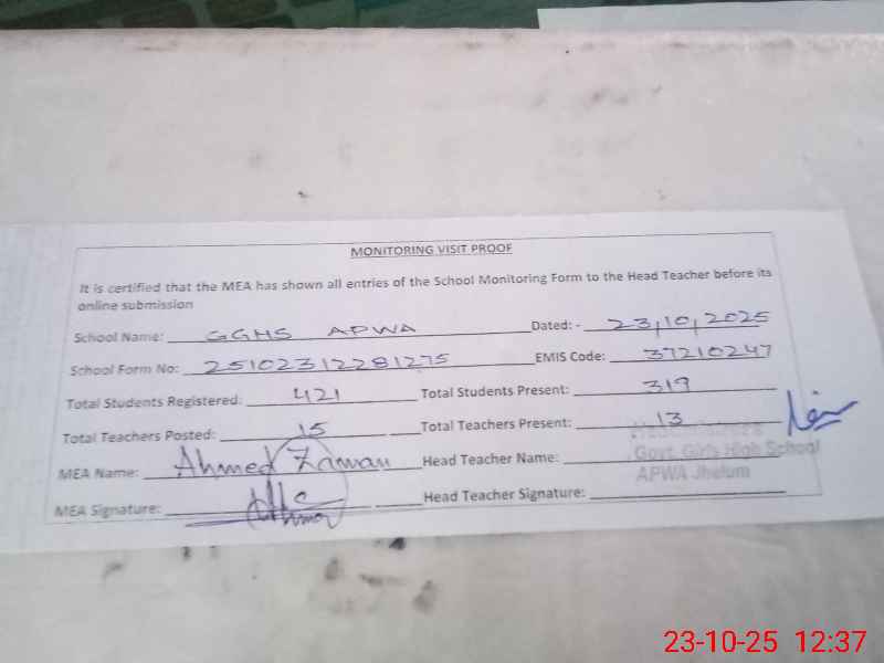 | EMIS Code: 37210247 | Name of School: GGHS APWA JHELUM | |||