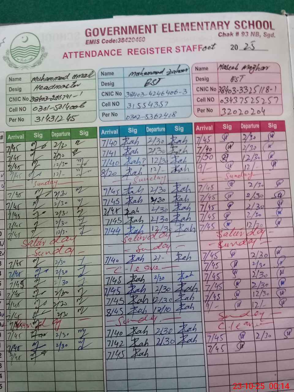 | CNIC | Full Name | Designation | R/C | Absence during last cal. month |