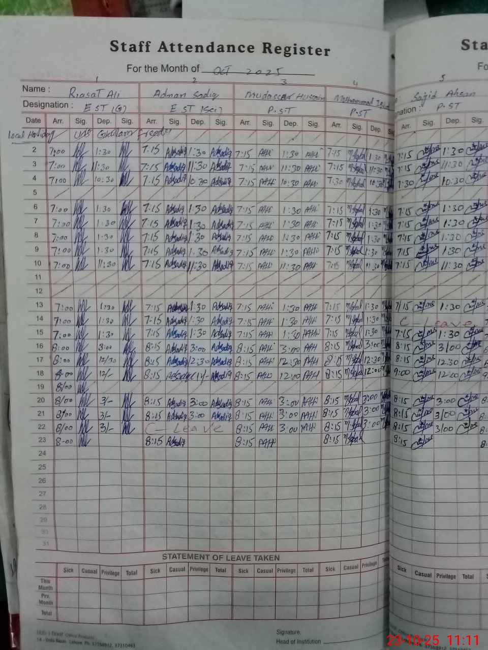 | CNIC | Full Name | Designation | R/C | Absence During Last Calender Month |