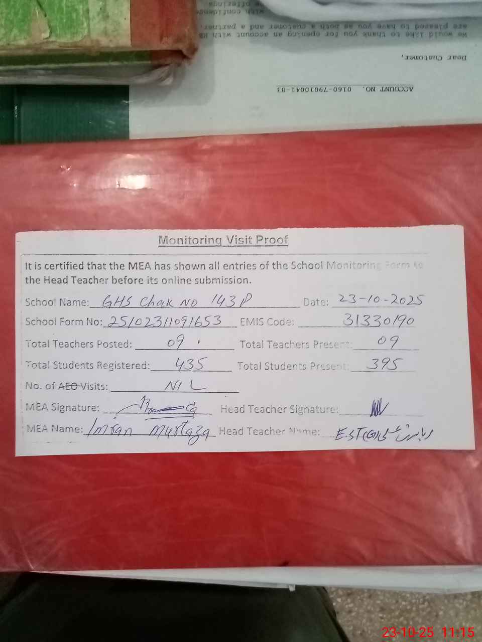 | Attendance Register | Head Teacher | MEA with School | Visit Proof |
