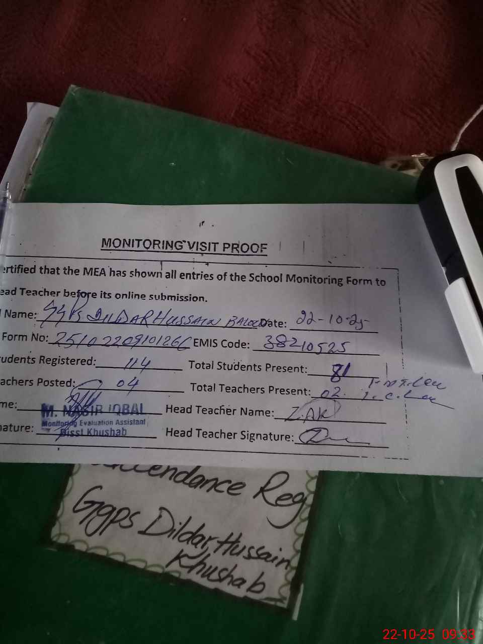 | Attendance Register | Head Teacher | MEA with School | Visit Proof |