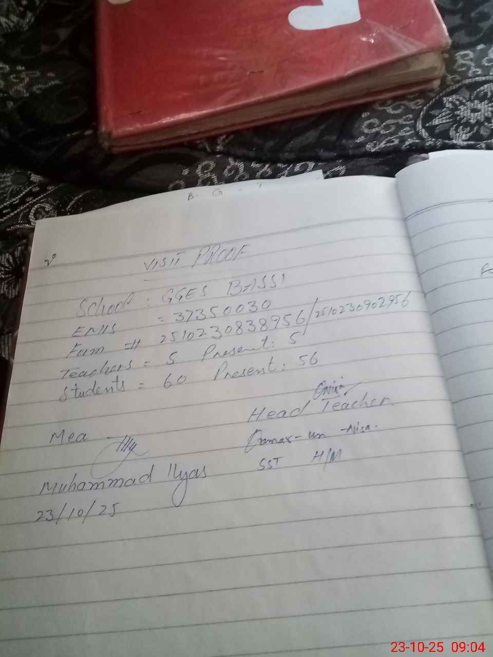 | Attendance Register | Head Teacher | MEA with School | Visit Proof |