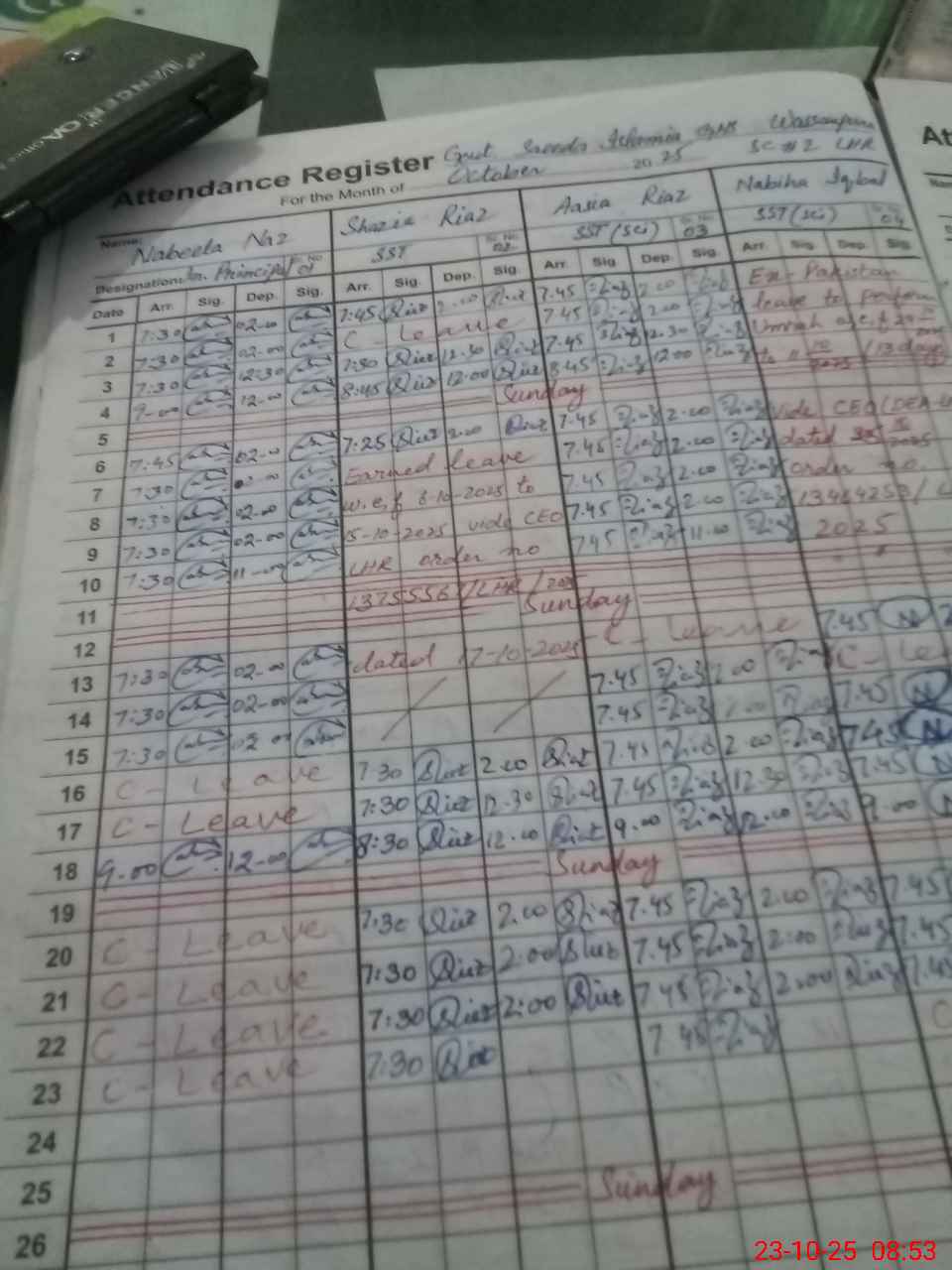 | 35**** | Im**** Kh**** | NQ | 0 | 0 | 2 | 0 | 0 | 0 | 0 | 0 | 0 | Absent (Un-Authorized) | |