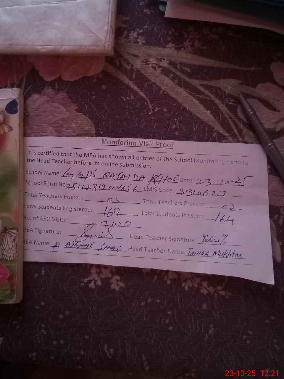 | Attendance Register | Head Teacher | MEA with School | Visit Proof |
