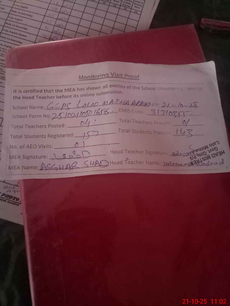| Attendance Register | Head Teacher | MEA with School | Visit Proof |