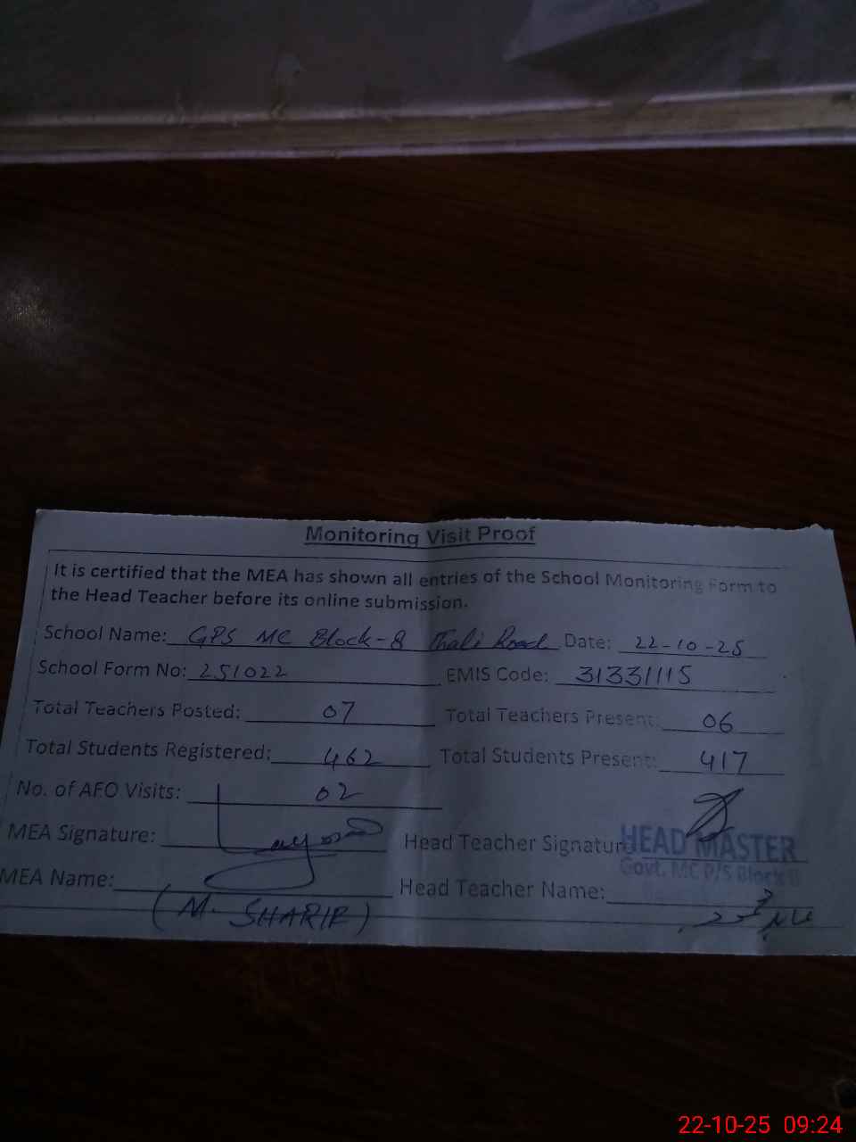 | Attendance Register | Head Teacher | MEA with School | Visit Proof |