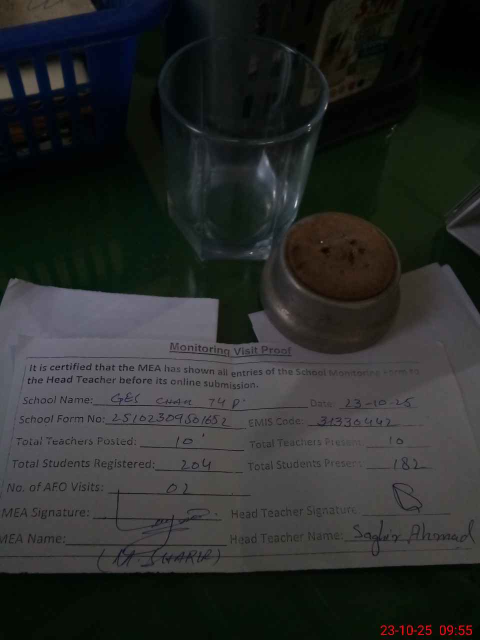 | Total no. of Classrooms: 8 No. of Classrooms Used for Teaching: 6 No. of Classrooms Storing Old Furniture, FTBs, etc: 0Comments if Any: NSB Cash book not maintained properly August September and October record was without dates FTF Ballance was same as on 01 January 25 No income no experience on record Condition of toilet block was very poor 02 toilets non functional out of 04 toile |