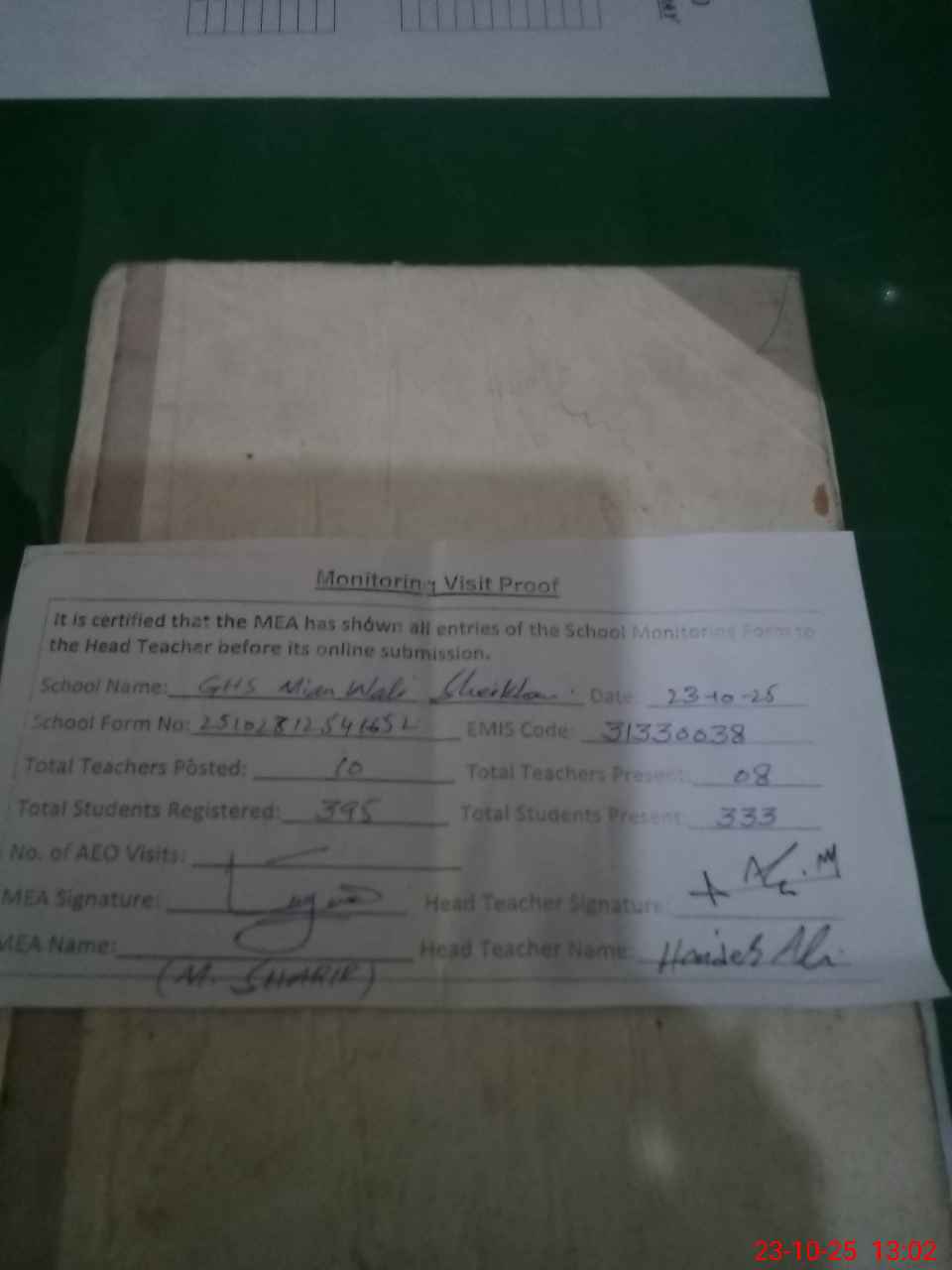 | Attendance Register | Head Teacher | MEA with School | Visit Proof |