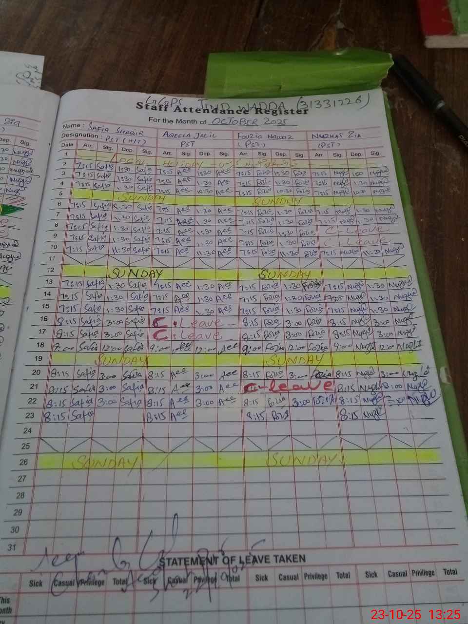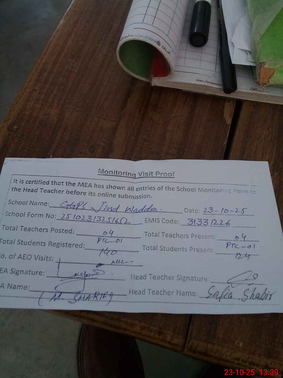 | Total no. of Classrooms: 3 No. of Classrooms Used for Teaching: 3 No. of Classrooms Storing Old Furniture, FTBs, etc: 0Comments if Any: NSB Cash book not maintained since May 2025 However roughly entries made with led pencil Record can not be considered No AEO visit during previous month |