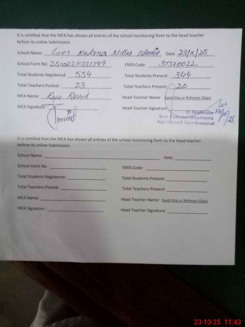 | Name: At**** UrRe**** Designation: (School Headmaster's/Headmistress's) HM Phone/Cell Number: 03**** |