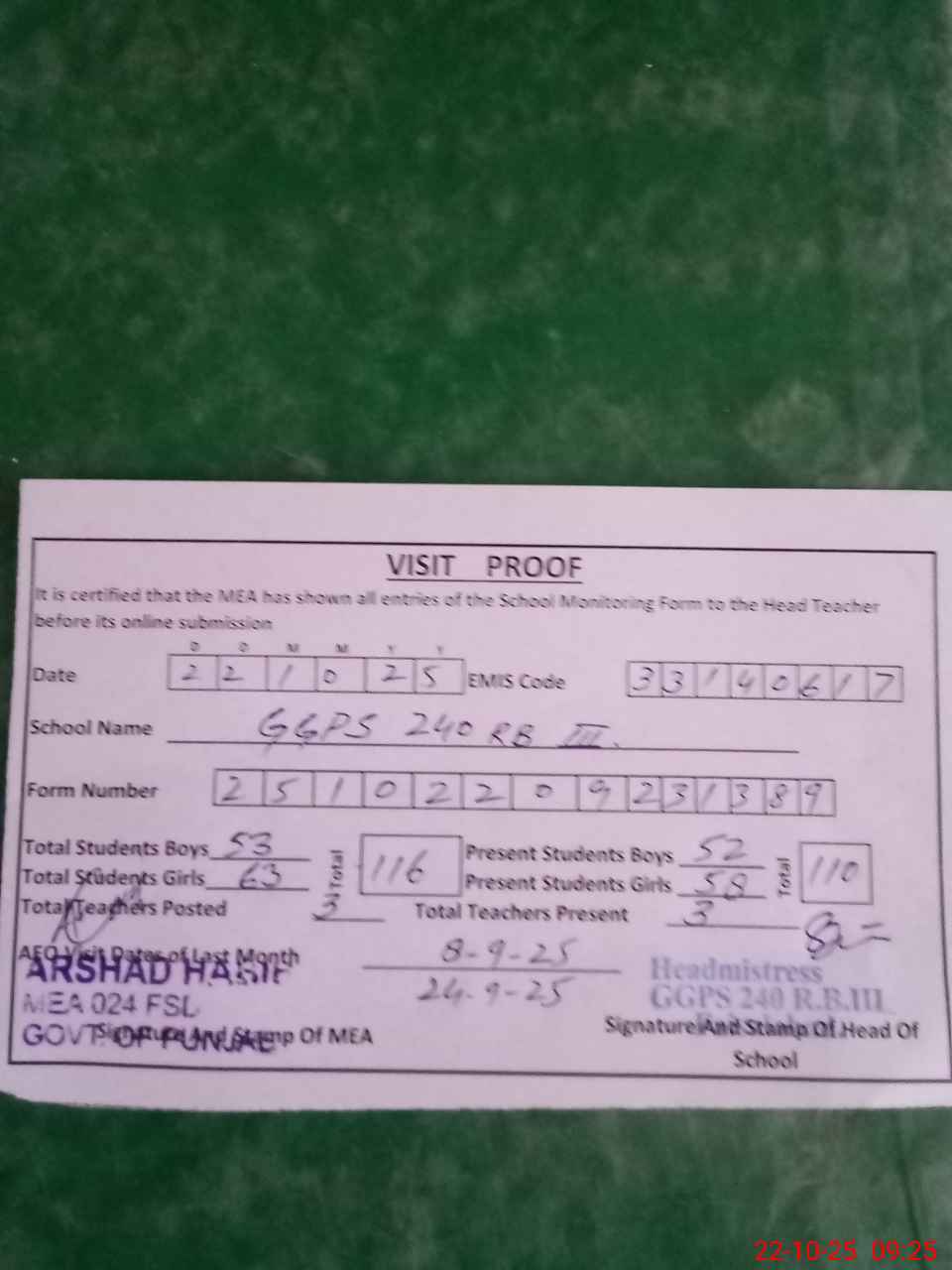 | Certified that this School was Inspected by the Undersigned MEA/DMO Today and the Information Stated Above is as Per Record. | |||||