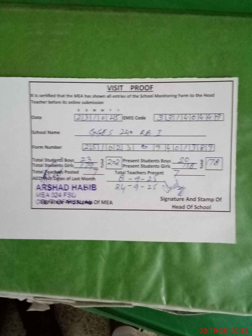 | Attendance Register | Head Teacher | MEA with School | Visit Proof |