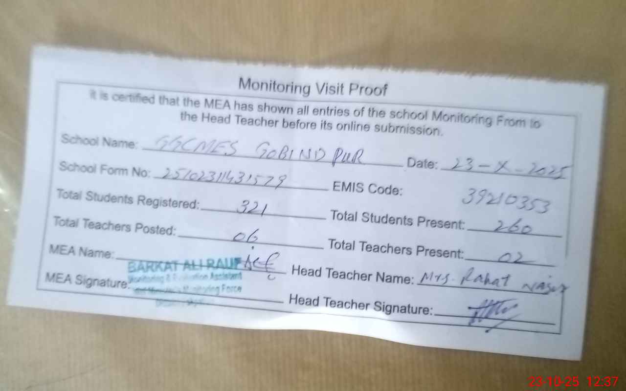 | EMIS Code: 39210353 | Name of School: GGCMES GOBIND PUR | |||