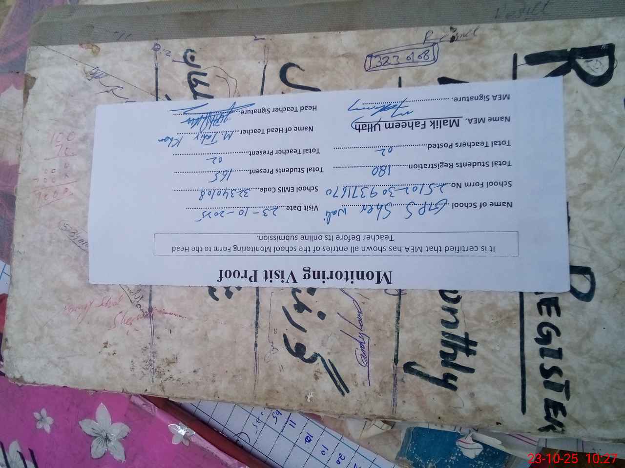 | Attendance Register | Head Teacher | MEA with School | Visit Proof |