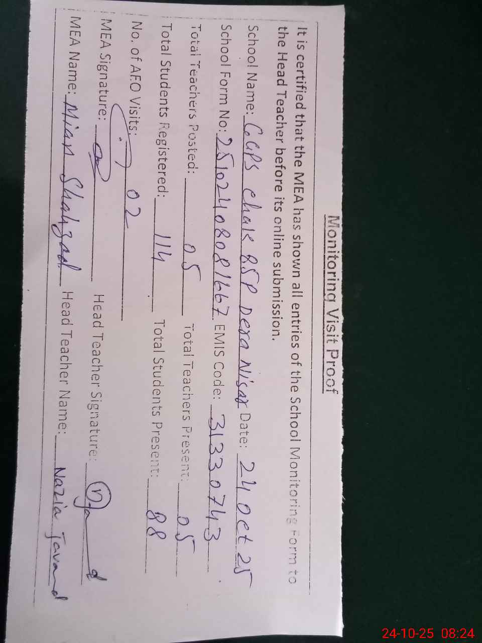 | Certified that this School was Inspected by the Undersigned MEA/DMO Today and the Information Stated Above is as Per Record. | |||||