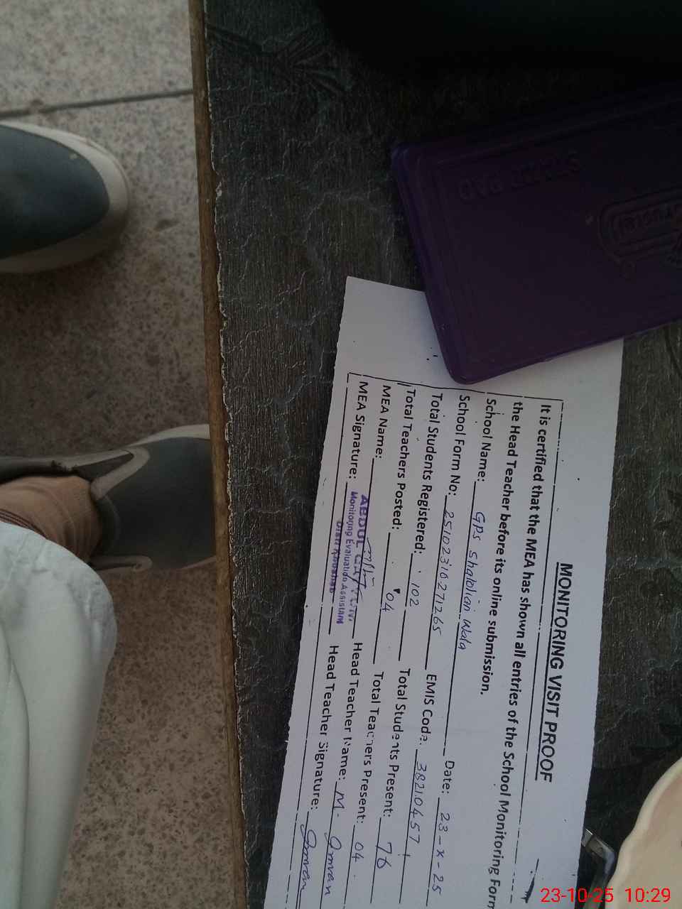 | Attendance Register | Head Teacher | MEA with School | Visit Proof |