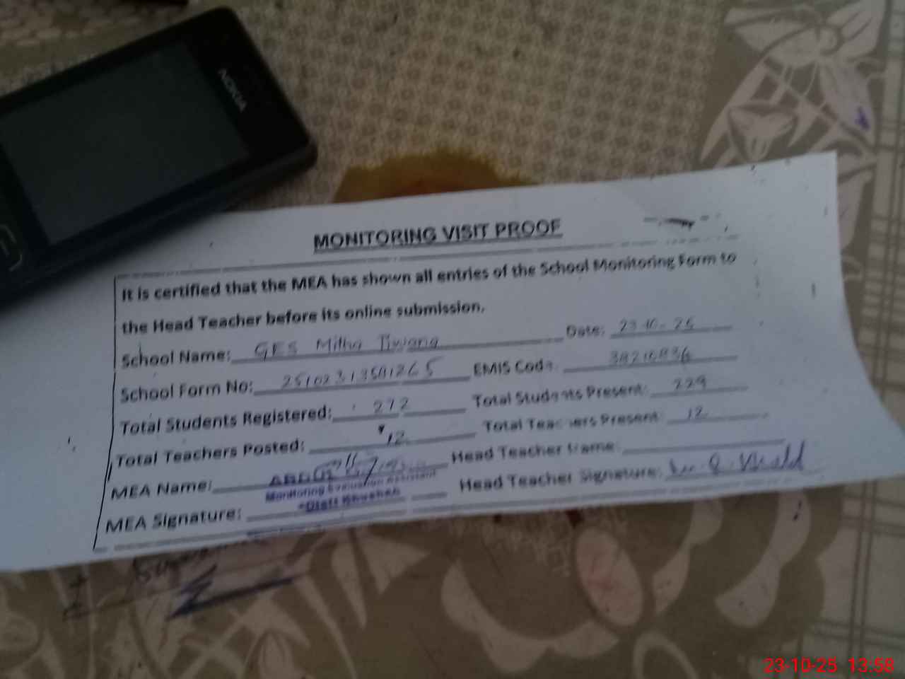 | Attendance Register | Head Teacher | MEA with School | Visit Proof |