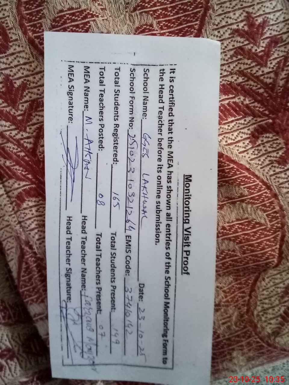| Attendance Register | Head Teacher | MEA with School | Visit Proof |