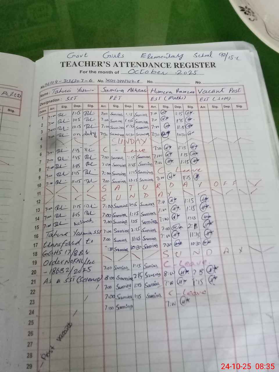 | CNIC | Full Name | Designation | R/C | Absence During Last Calender Month |