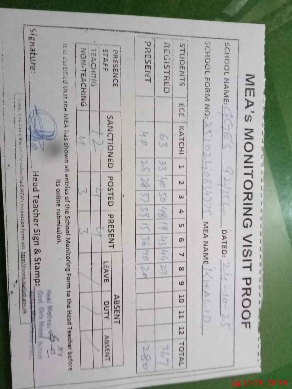 | Attendance Register | Head Teacher | MEA with School | Visit Proof |