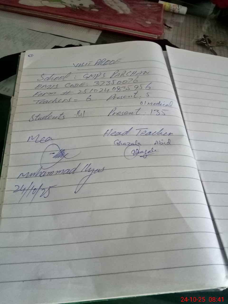 | Attendance Register | Head Teacher | MEA with School | Visit Proof |