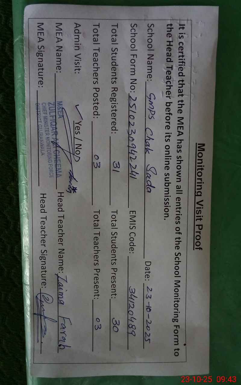 | EMIS Code: 34120489 | Name of School: GMPS CHAK SADA | |||