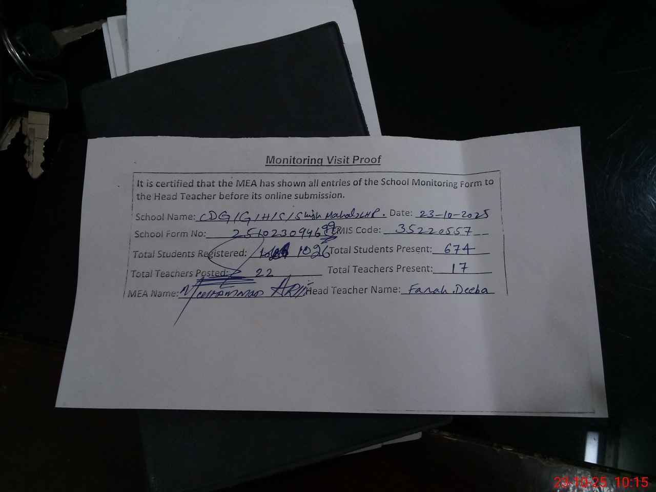 | Attendance Register | Head Teacher | MEA with School | Visit Proof |