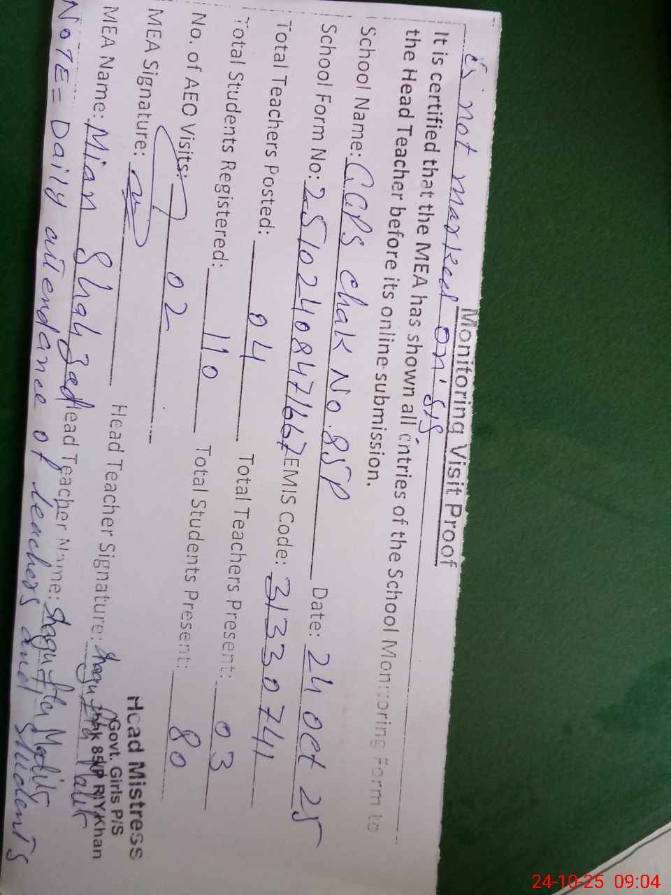 | Attendance Register | Head Teacher | MEA with School | Visit Proof |