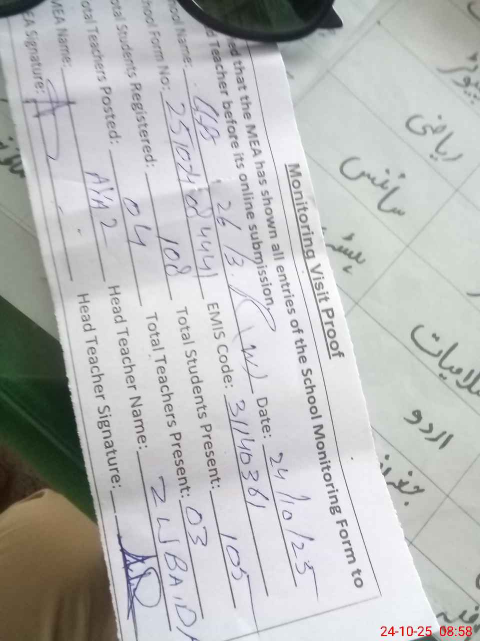 | Attendance Register | Head Teacher | MEA with School | Visit Proof |