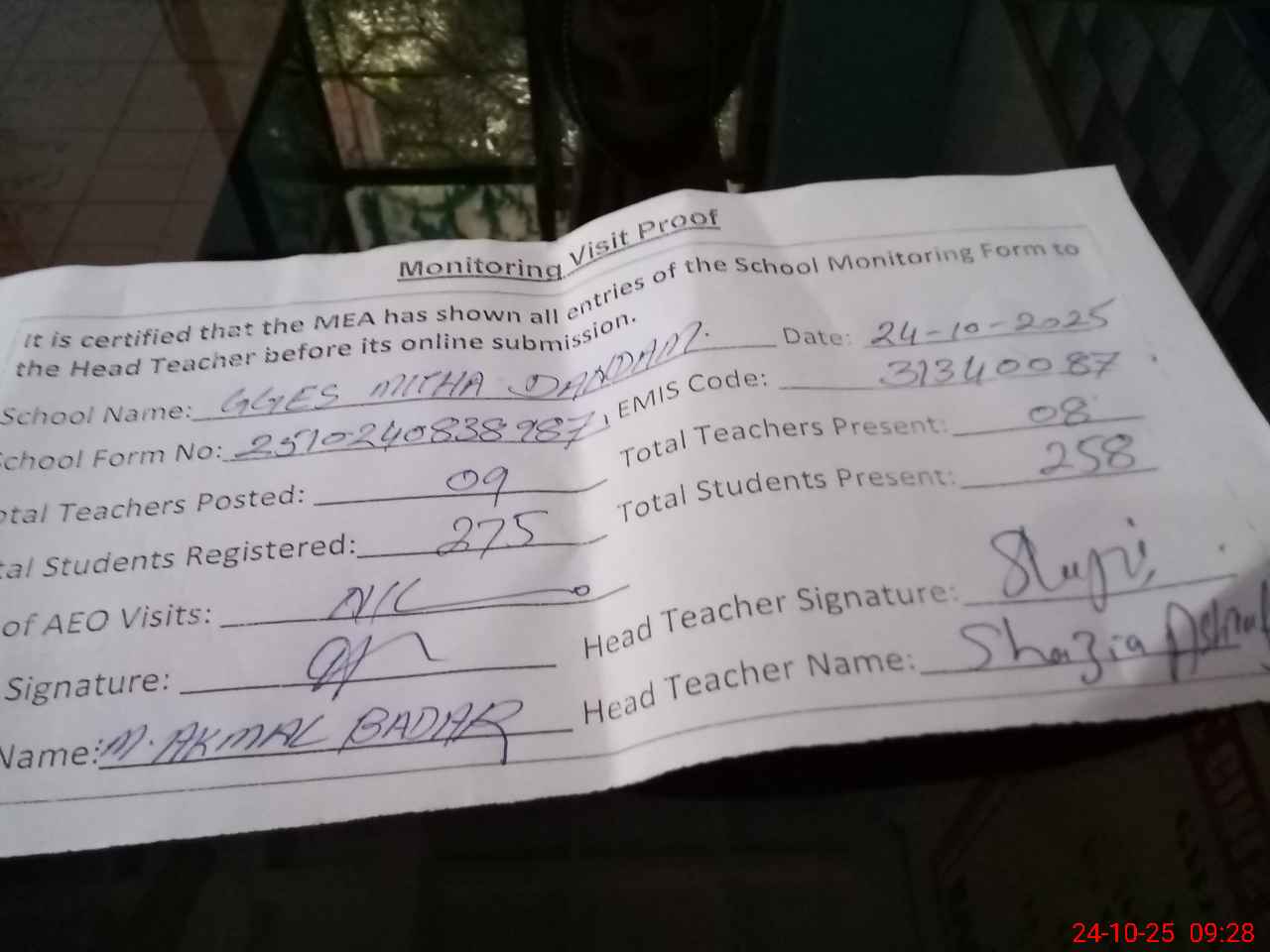 | Attendance Register | Head Teacher | MEA with School | Visit Proof |