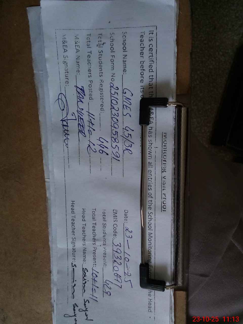 | Attendance Register | Head Teacher | MEA with School | Visit Proof |