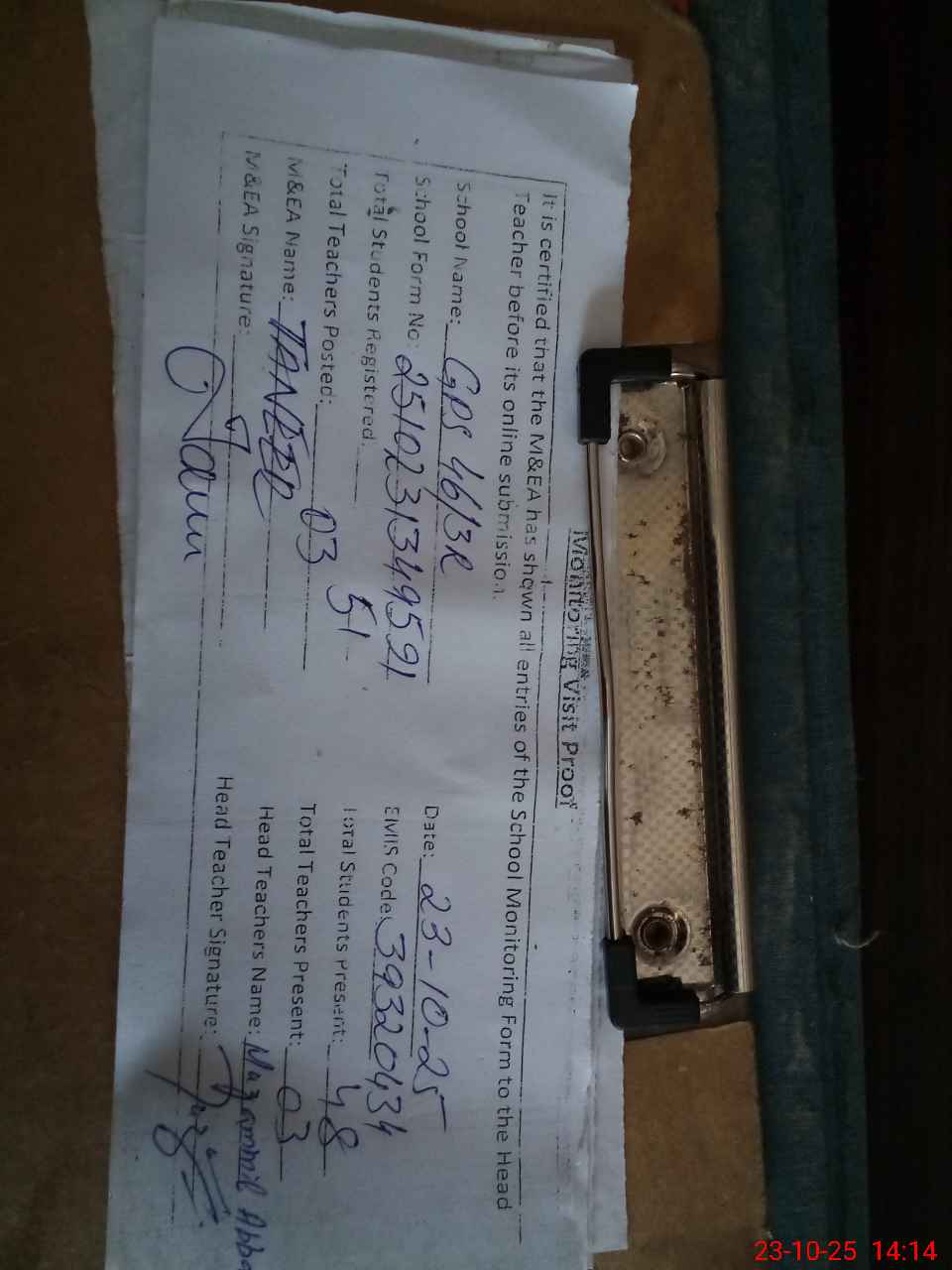 | Attendance Register | Head Teacher | MEA with School | Visit Proof |