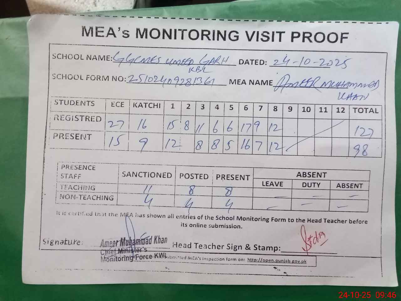 | Attendance Register | Head Teacher | MEA with School | Visit Proof |