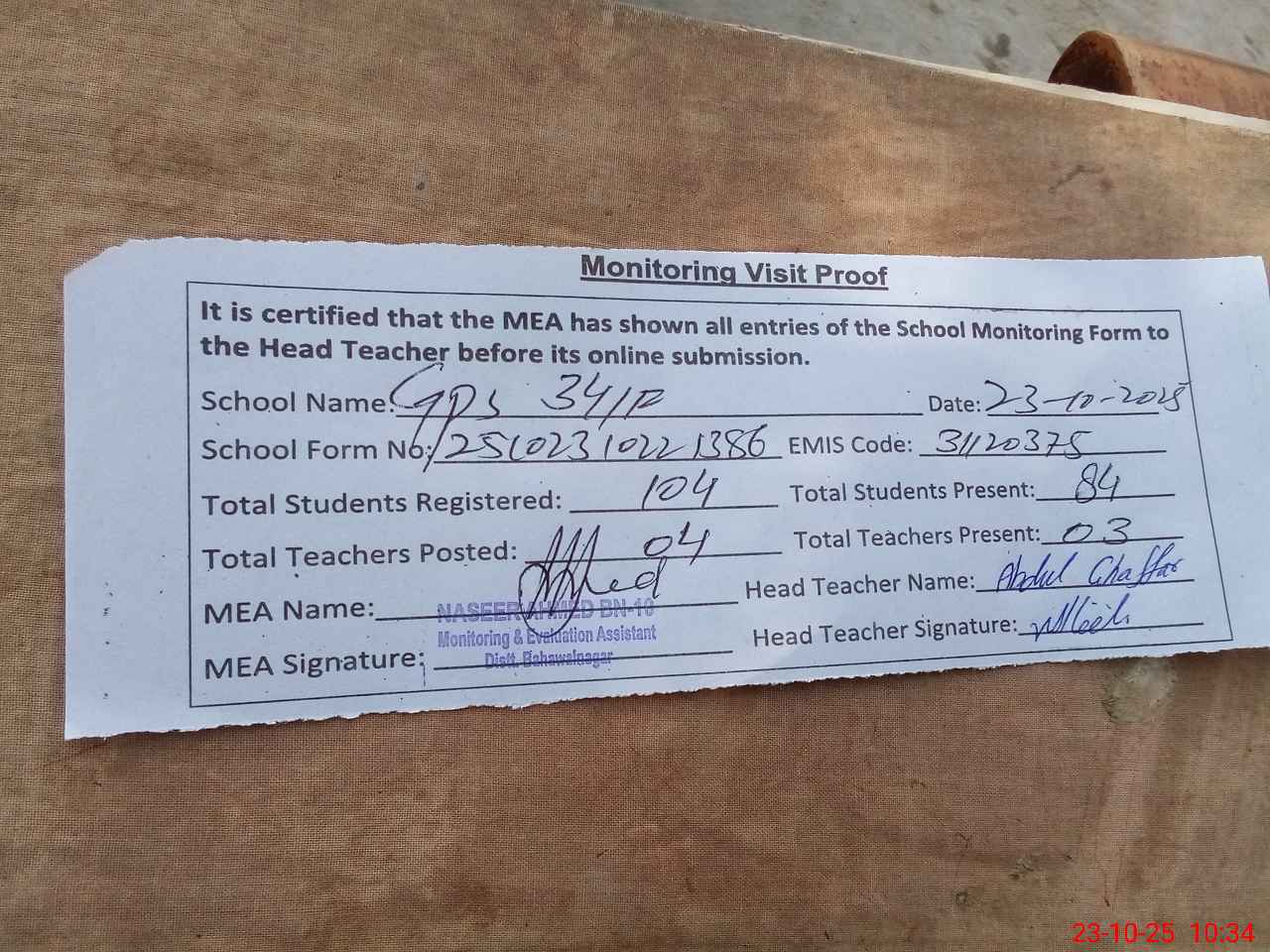| Attendance Register | Head Teacher | MEA with School | Visit Proof |