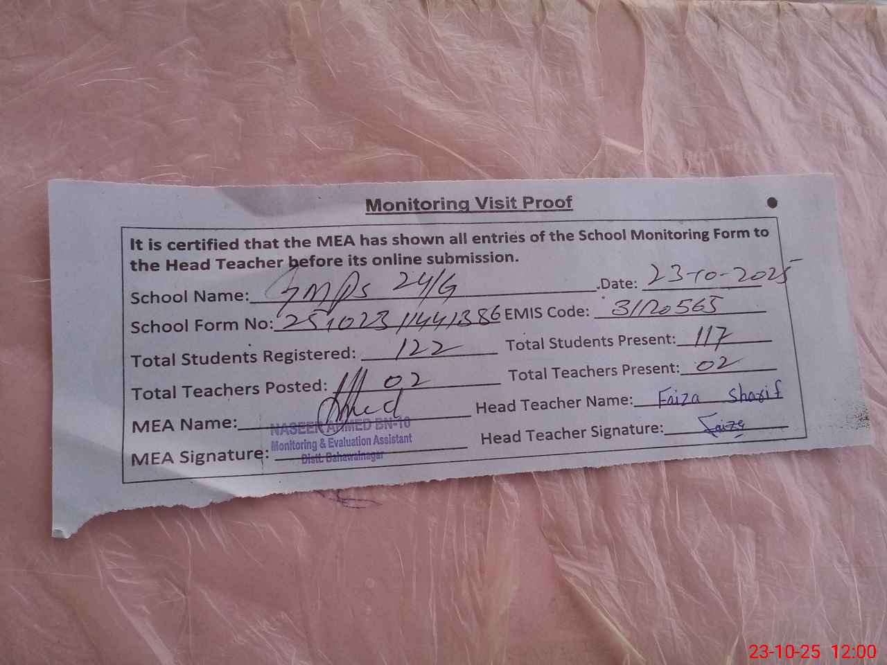 | EMIS Code: 31120565 | Name of School: GMPS CHAK NO. 24 GAJIANI | |||