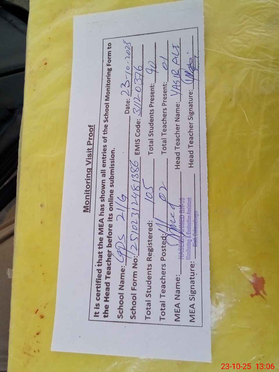 | Attendance Register | Head Teacher | MEA with School | Visit Proof |