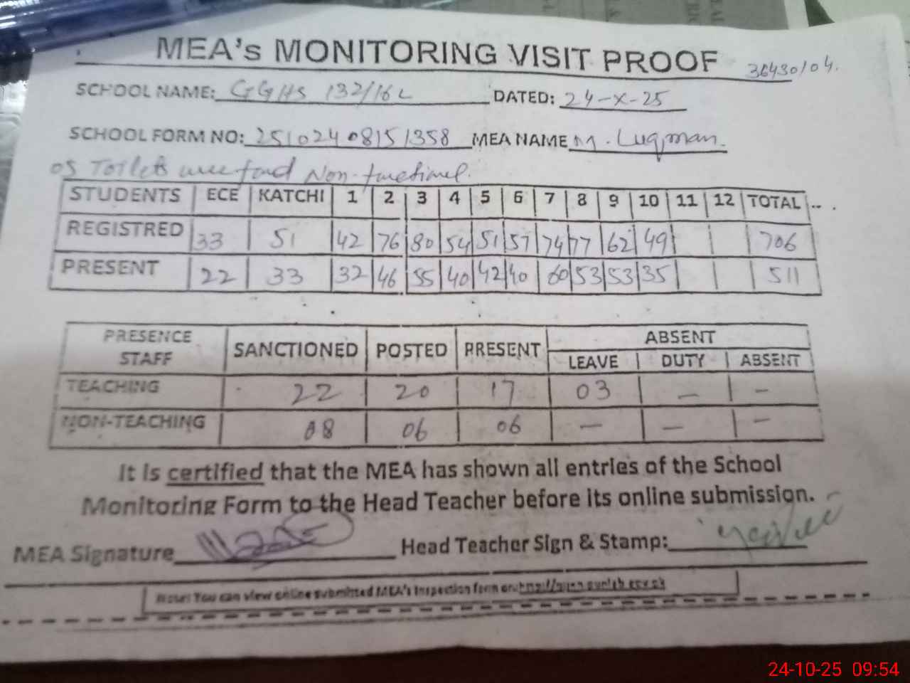| EMIS Code: 36430104 | Name of School: GGHS 132/16-L, MIAN CHANNU | |||