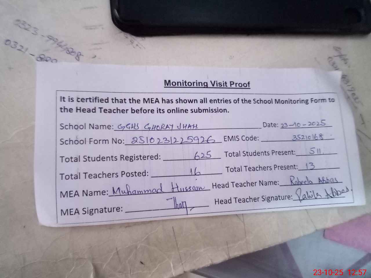| EMIS Code: 35210168 | Name of School: GGHS GHORAY SHAH(Newly upgraded) | |||