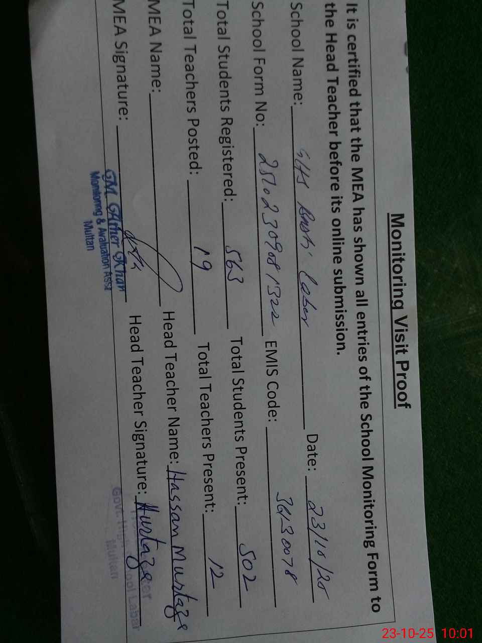 | Attendance Register | Head Teacher | MEA with School | Visit Proof |