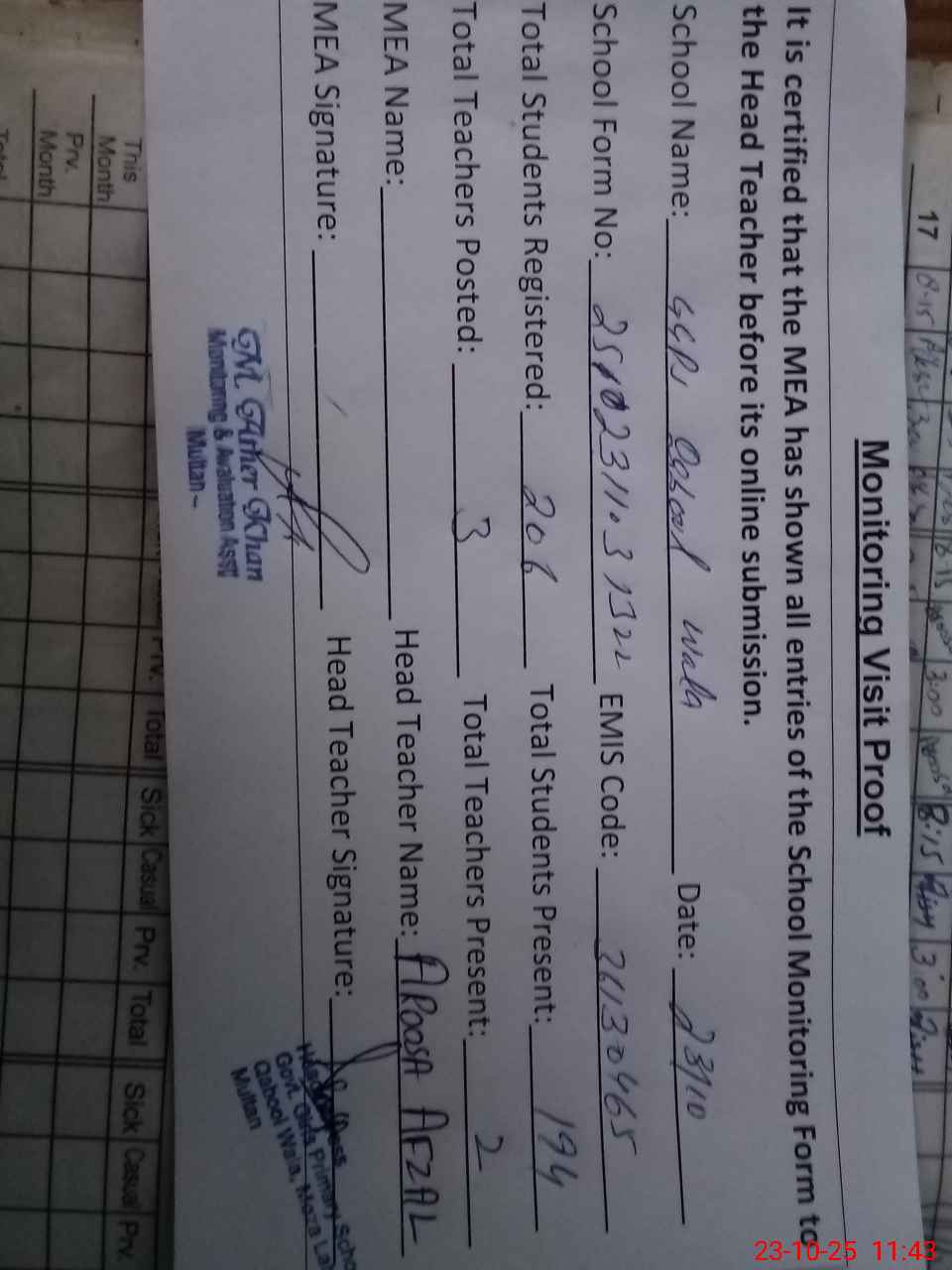 | Attendance Register | Head Teacher | MEA with School | Visit Proof |