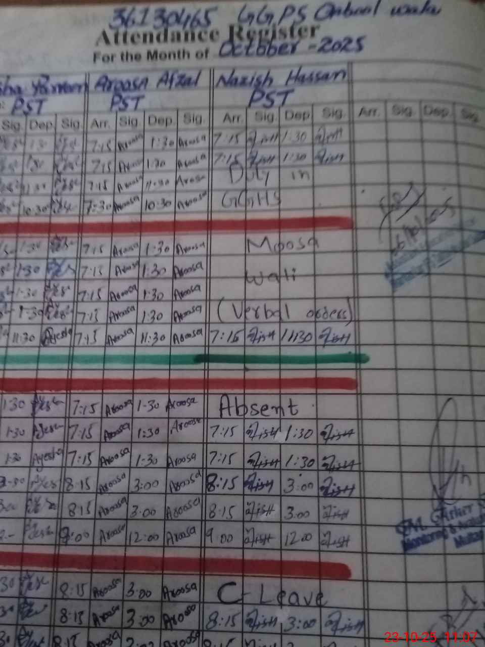 | CNIC | Full Name | Designation | R/C | Absence During Last Calender Month |