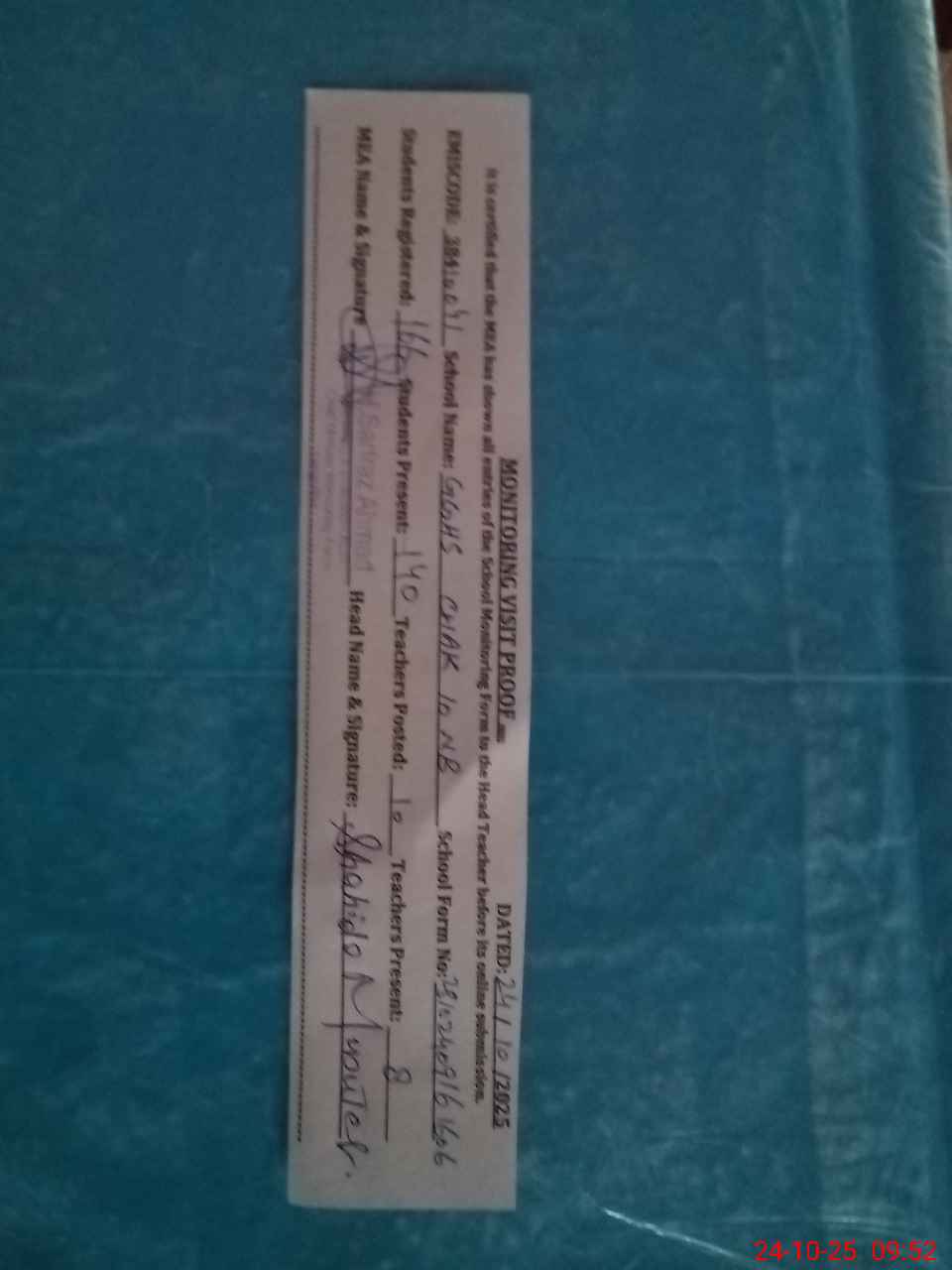 | Certified that this School was Inspected by the Undersigned MEA/DMO Today and the Information Stated Above is as Per Record. | |||||