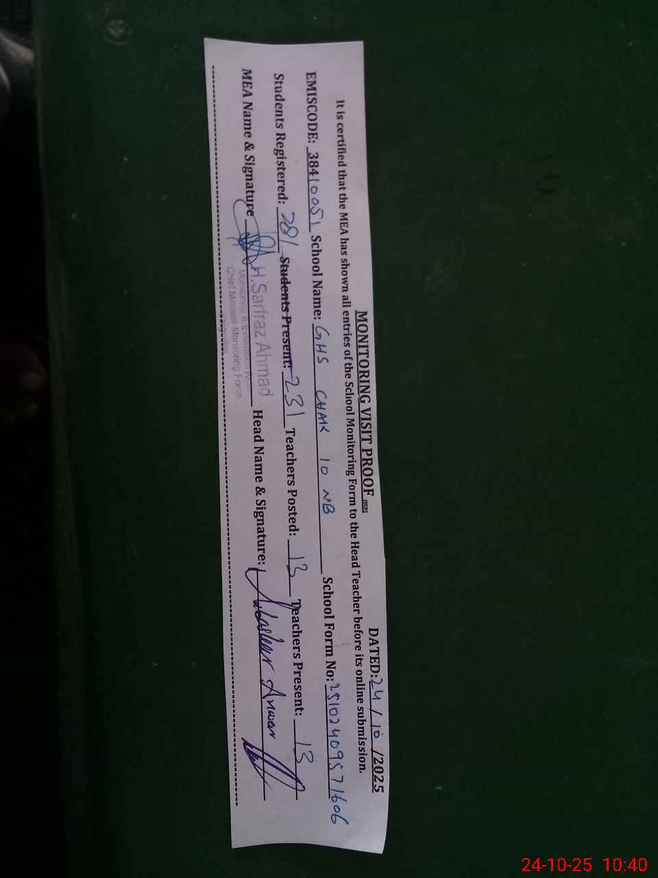 | Certified that this School was Inspected by the Undersigned MEA/DMO Today and the Information Stated Above is as Per Record. | |||||