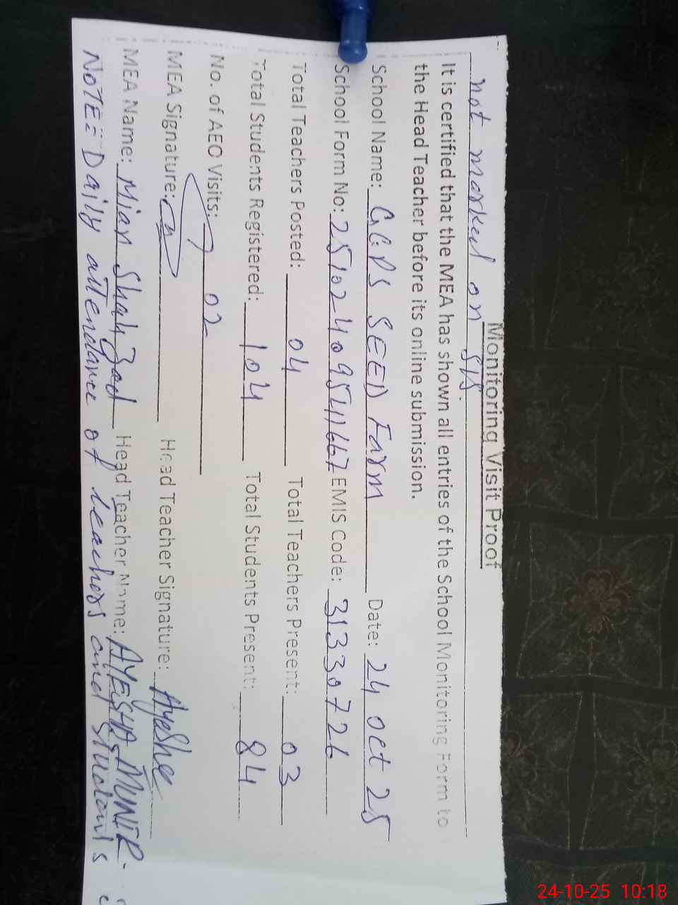 | Remarks (Use Separate Page if Required): Daily attendance of teachers and students is not marked on SIS | |||||