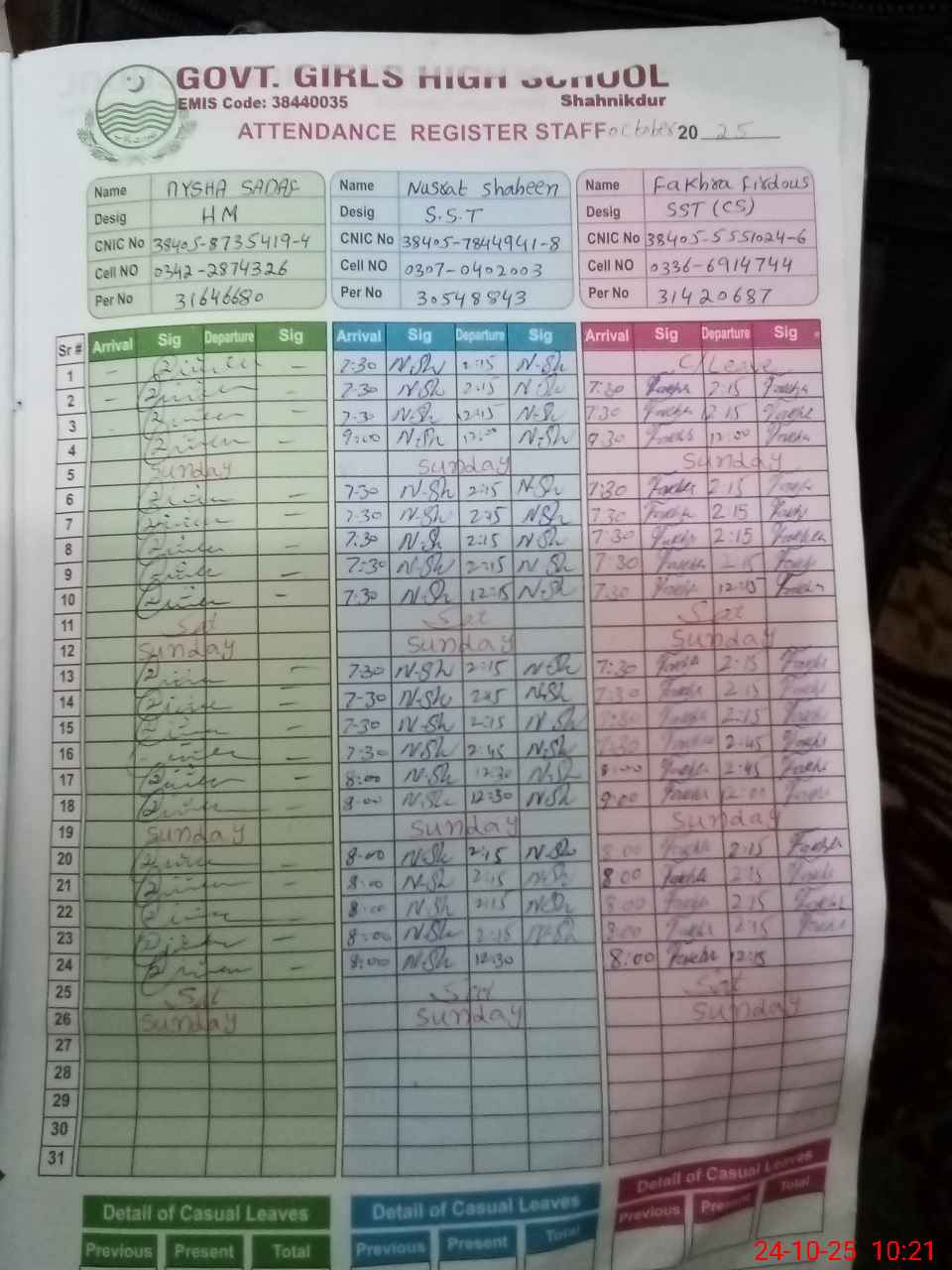 | CNIC | Full Name | Designation | R/C | Absence during last cal. month |