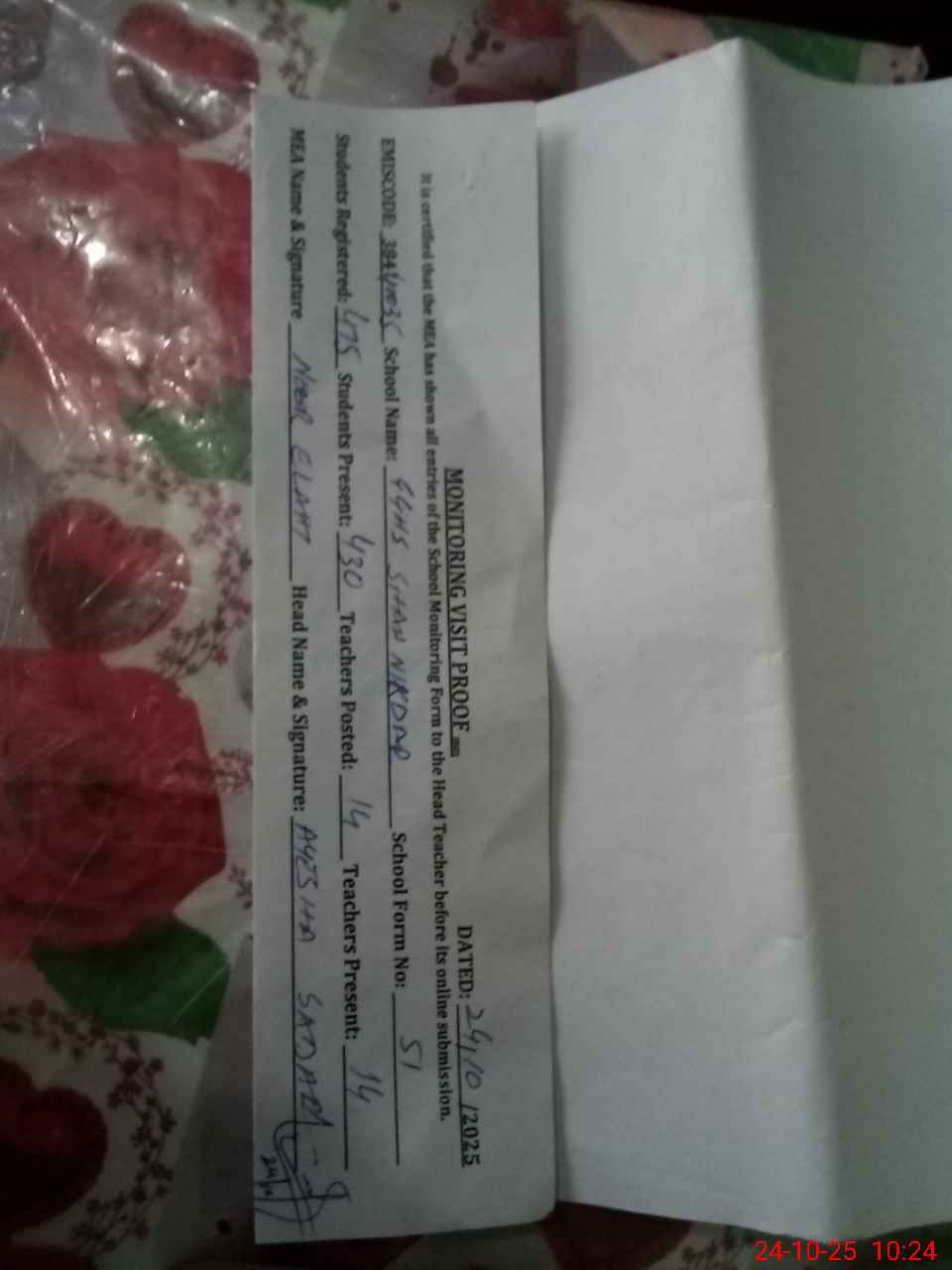 | Certified that this School was Inspected by the Undersigned MEA/DMO Today and the Information Stated Above is as Per Record. | |||||